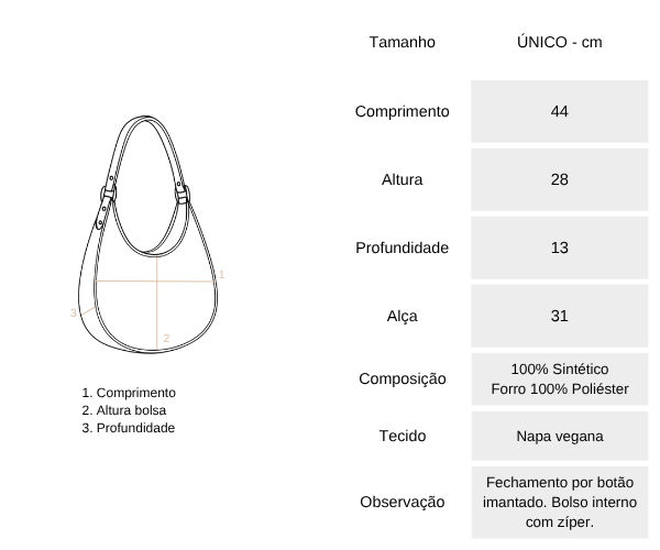 INSTRUÇÃO DE LAVAGEM: Para a limpeza da sua bolsa utilize um pano úmido com água e detergente neutro.