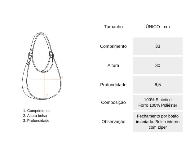 INSTRUÇÃO DE LAVAGEM: Para a limpeza da sua bolsa utilize um pano úmido com água e detergente neutro.